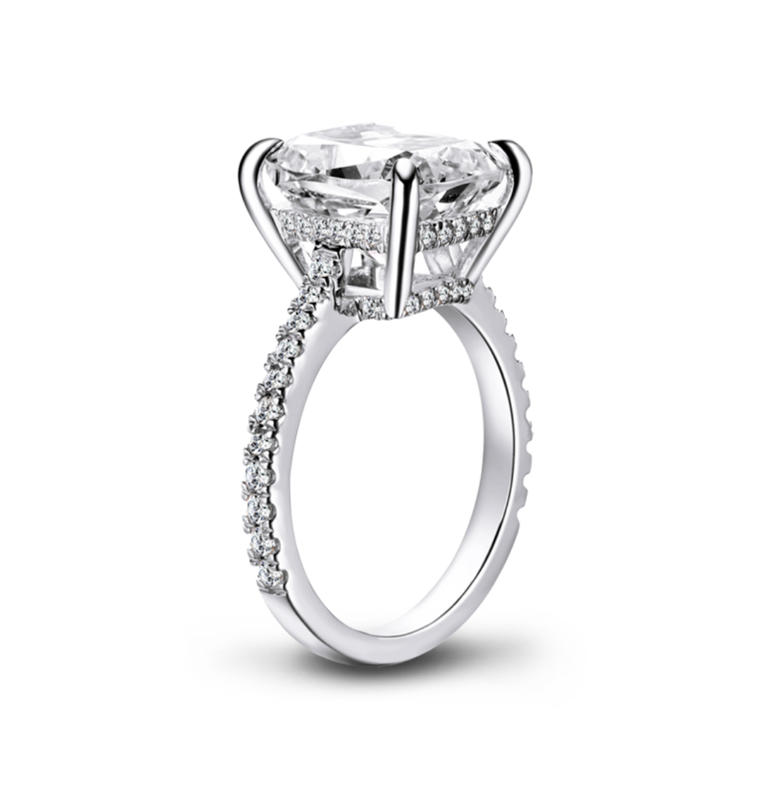 Our stunning 6 Carat white brilliant, cushion cut engagement ring is an exceptional ring, a modern take on a classic design.