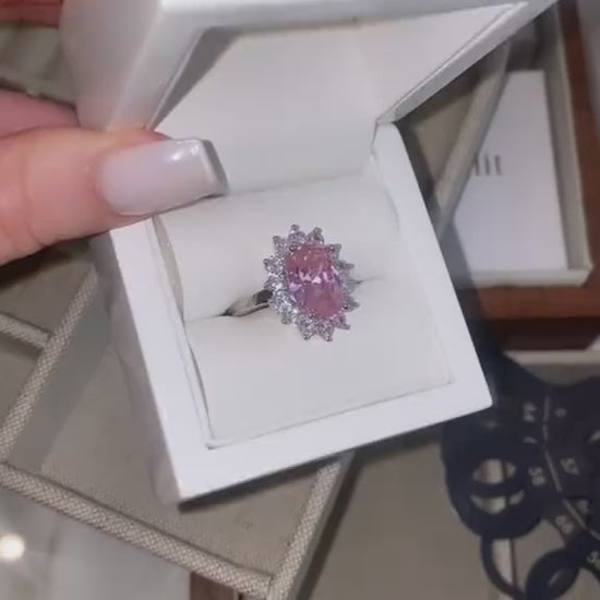 Our stunning 6 Carat pink sapphire engagement ring features an oval-shaped center stone, surrounded by delicate round brilliant stones reminiscent of a blooming daisy. Inspired by Lady Gaga's iconic engagement ring from Christian Carino, this unique piece is a romantic and bold choice for proposals, anniversaries, or statement occasions.