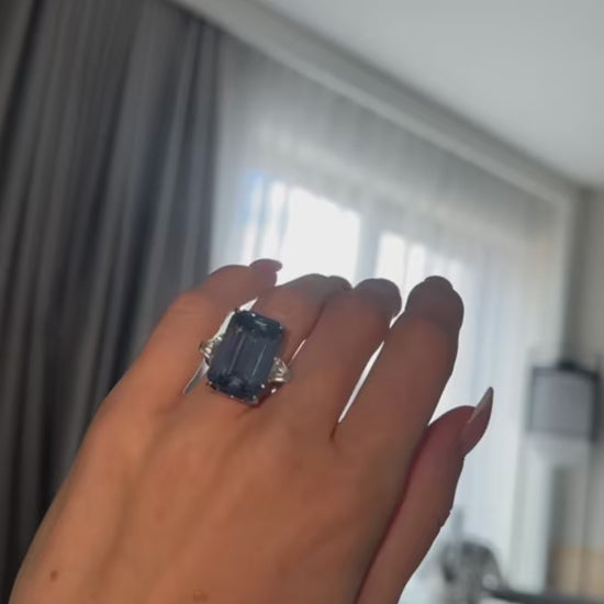 Make a bold statement with our stunning 32 Carat royal blue emerald cut ring, inspired by the legendary Oppenheimer Blue Diamond. This luxurious gemstone ring features a striking 13mm x 20mm royal blue stone, beautifully mounted on a classic 925 sterling silver band. Perfect as a statement piece, cocktail ring, or a unique engagement ring for her.